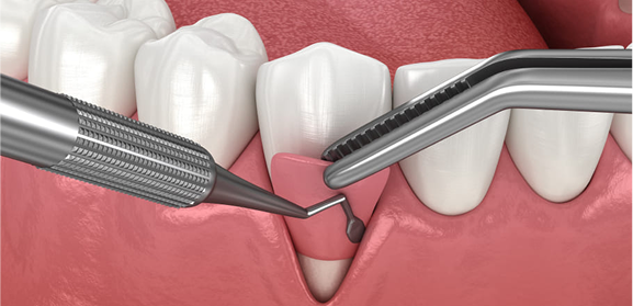 A non-surgical deep cleaning that removes plaque and tartar beneath the gumline and smooths tooth roots to aid healing.